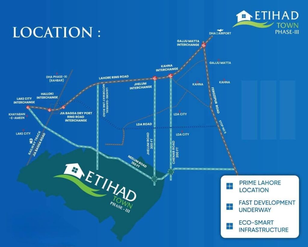 Etihad Town Phase-III enjoys an exceptionally strategic and central location in Lahore, providing seamless connectivity and convenient access to key parts of the city. Situated near the Jia Bagga Road and in close proximity to Lahore Ring Road, this mega project ensures smooth travel to and from all major areas including Lake City, Khayaban-e-Ameen, LDA City, and Ferozepur Road.