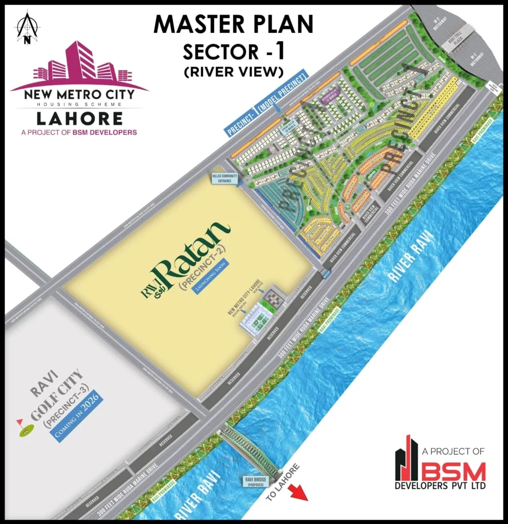 New Metro City Lahore, developed by BSM Developers, sets a new standard in contemporary living with its prime location, modern infrastructure, and exceptional amenities. Positioned along the banks of the River Ravi, it offers an exclusive lifestyle and a promising investment opportunity.